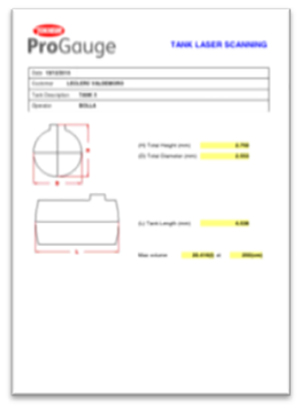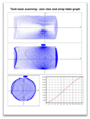 The system produces a detailed report showing the tank dimensions, an overview of the scan area and the tank chart/strapping table.